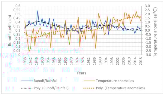 As can be seen from Figure 8, the areas with the highest values of the runoff coefficient correspond to the lowest values of temperature anomalies. Thus, from 1938 to 1965, when negative air temperature anomalies prevailed, the highest values of the runoff coefficient were observed. In this period, the gradual increase in anomalies was accompanied by a decrease in the runoff coefficient.