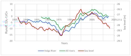 As is known, the difference integral curve gives a more visual representation of the flow fluctuation cycles, which can be compared with sea level fluctuations. The difference integral curves for the Volga River runoff and the total runoff of all rivers flowing into the sea were constructed using Formula (1) based on contact observations (Figure 9).