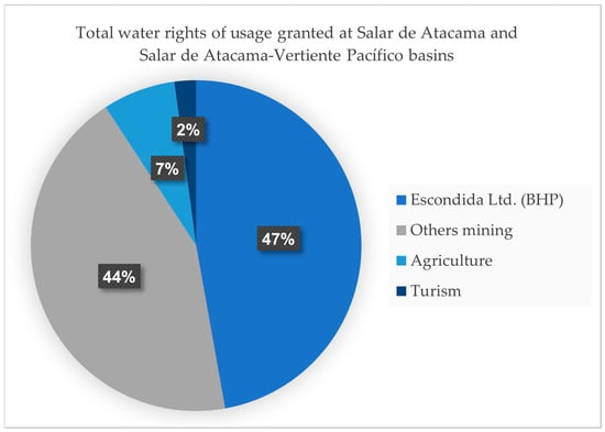 According to the Water Atlas collated by the Chilean General Water Directorate (DGA) [15], as of August 2015, 52,581 water rights were granted, of which 81.7% are consumptive and 18.3% are non-consumptive. Within this, the flow of groundwater delivered to the same date corresponds to 467.3 cubic meters per second, while that of surface water amounts to 40,007.71 cubic meters per second. The majority of granted surface water rights correspond to non-consumptive types whereas the groundwater rights are mostly consumptive and definitive [15]. As a result of this legislation, in regions of Chile where mining is the primary economic activity, the majority of water rights are allocated to mining companies, which can leave other stakeholders with limited access to water and make it challenging to implement holistic approaches.