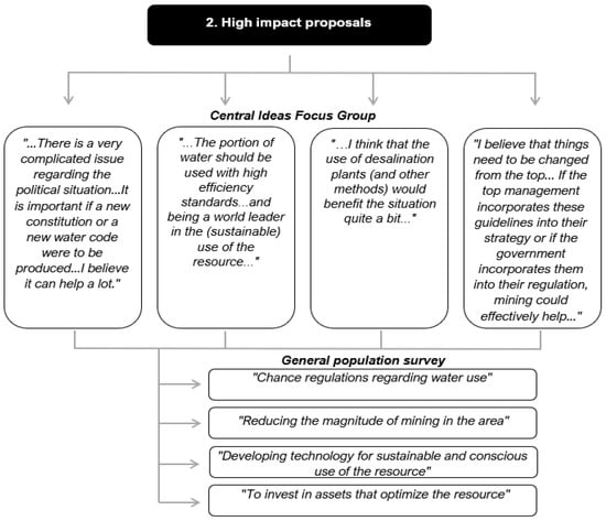 Regarding the stage of high-impact proposals, despite three of the twelve focus group members being active collaborators in the mining industry, they all presented different proposals to address the issue. Among the options, investment in assets that optimize water use or increase the availability of the water resource stands out, since it had a high degree of acceptance among respondents. According to the analysis of strategies and their prioritization, this alternative was configured as one of the most feasible and with the greatest impact. However, its main disadvantage is the high investment of resources necessary for its implementation, which suggests the need to establish participatory engagement to obtain feasible agreements with communities to make its execution viable. In this regard, the majority of focus group members indicate that the strategy could work, albeit under certain conditions. These results are consistent with the conclusions of Rodríguez et al. [36], who highlighted the importance of establishing direct and mutually beneficial communication relationships with communities to obtain and maintain SLO. These results are also supported by the projection made by EY [37], where the main risk and opportunity that the mining industry is facing nowadays is to incorporate environmental, social, and governance (ESG) practices.
