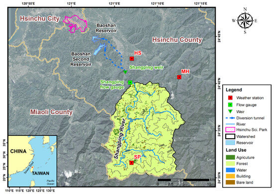 The landscape of the Shangping River Watershed, including weather stations, flow gauge, and land use patterns. Water from the Shangping River is diverted into the Baoshan Reservoir and Baoshan Second Reservoir through the Shangping Weir to supply the demand of Hsinchu Science Park. The three weather stations are the Shei-Pa (SP), Heng-Shan (HS), and Mei-Hua (MH) stations.