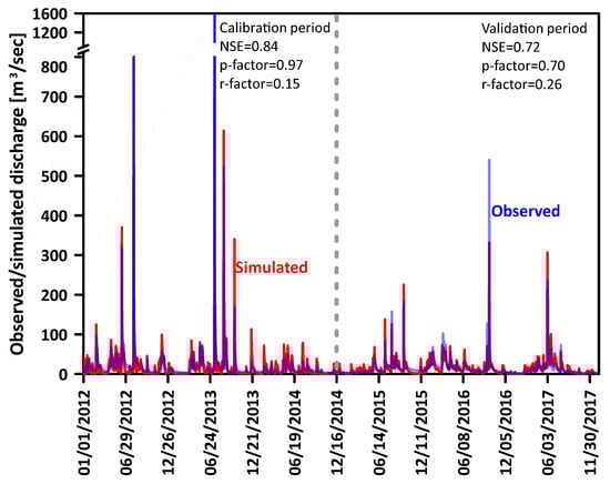 Figure 3 illustrates the observed and simulated daily discharge at the Shangping flow gauge. The results showed that SWAT could simulate daily discharge very well, with the NSE at 0.84/0.72 for the calibration/validation, which was more than satisfactory compared to worldwide discharge simulations [52]. The p-factor and r-factor indices were used to judge the strength of calibration and validation. The p-factor/r-factor was 0.97/0.15 for the calibration and 0.70/0.26 for the validation period, which was fairly good as well [53]. For the study watershed and all the watersheds in Taiwan, the three-order magnitude variation of daily discharge, mostly owing to typhoon invasion, increased the complexities of simulating watershed hydrology. However, the high p-factor, low r-factor, and high NSE in this study indicated that SWAT model uncertainties fell within the permissible limits. Hence, the verified model can be used for further applications, such as the assessment of the impact of climate change on river discharge in the Shangping Watershed.