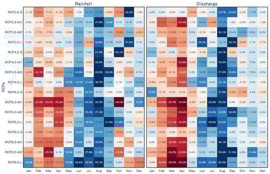 The change rates [%] in monthly rainfall and discharge between the Baseline Period and the S, M1, M2, and L Periods under the RCP2.6, RCP4.5, RCP6.0, and RCP8.5 scenarios. The calculation of the percentage in the figure is defined as (Future estimates − Baseline estimates)/(Baseline estimates) × 100%. The number in each cell of the figure, for the discharge panel, represents the median of all GCM/ESM results for a specific scenario, month, and Period. For the rainfall panel, the average of the results from the three weather stations is shown. The color of the cell represents the degree of change rate: white indicates 0%, blue indicates >0% (the darker the blue, the more positive the change), and red indicates <0% (the darker the red, the more negative the change). The historical average monthly flow rates are 4.88 (Jan.), 9.49 (Feb.), 12.12 (Mar.), 13.79 (Apr.), 15.64 (May), 23.04 (Jun.), 18.08 (Jul.), 31.65 (Aug.), 22.55 (Sep.), 11.31 (Oct.), 4.60 (Nov.), and 5.12 (Dec.) cms, respectively, as a reference.