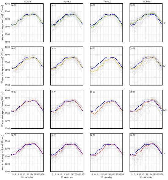 The average year-round total water storage volume of Baoshan Reservoir and Baoshan Second Reservoir under (a) RCP2.6, (b) RCP4.5, (c) RCP6.0, and (d) RCP8.5 scenarios for the Baseline, S(-1), M1(-2), M2(-3), and L(-4) Periods. Blue curves indicate the results of the Baseline, remaining identical in every panel as a reference. Grey curves are the results of all the GCMs/ESMs for the corresponding scenario and Period. Green, yellow, orange, and red curves represent the median of the grey curves for the Periods of S, M1, M2, and L, respectively.
