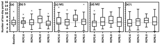 The number of ten-day periods when water storage volume (WSV) was below the operation rule curve (ORC) in the (a) Baseline, (b) S, (c) M1, (d) M2, and (e) L Periods under Baseline, RCP2.6, RCP4.5, RCP6.0, and RCP8.5 scenarios. Each box contains the annual mean number of ten-day periods over the 19 years when WSV < ORC derived from all the GCMs/ESMs for a specific scenario and Period. A grey line, representing the condition for the Baseline Period, is drawn as a reference. Values exceeding 1.5 times the interquartile range are defined as outliers (cross symbols).