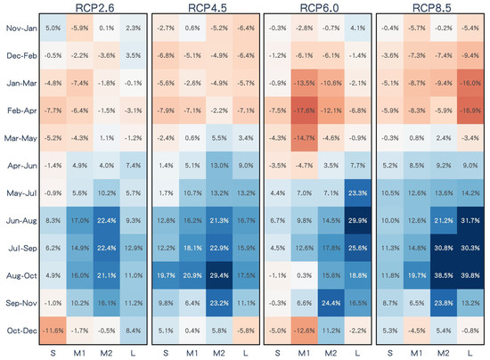 The change rates [%] in three-month cumulative rainfall between the Baseline Period and the S, M1, M2, and L Periods under the RCP2.6, RCP4.5, RCP6.0, and RCP8.5 scenarios. The calculation of the percentage in the figure is defined as (Future estimates − Baseline estimates)/(Baseline estimates) × 100%. The number in each cell of the figure represents the median of all GCM/ESM results for a specific scenario, 3-month period, and Period. The color of the cell represents the degree of change rate: white indicates 0%, blue indicates >0% (the darker the blue, the more positive the change), and red indicates <0% (the darker the red, the more negative the change). The three-month cumulative rainfall levels corresponding to SPI-3 equal to zero, calculated by using June 1987 to December 2017 data for the MH weather station, are 175 mm (Nov.–Jan.), 261 mm (Dec.–Feb.), 367 mm (Jan.–Mar.), 450 mm (Feb.–Apr.), 565 mm (Mar.–May), 663 mm (Apr.–Jun.), 702 mm (May–Jul.), 799 mm (Jun.–Aug.), 768 mm (Jul.–Sep.), 627 mm (Aug.–Oct.), 317 mm (Sep.–Nov.), and 163 mm (Oct.–Dec.).
