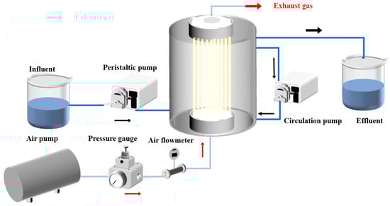 Figure 1 illustrates the schematic of the MABR system. Four identical MABRs were established, each with an actual working volume of 1.88 L (a cylinder 10 cm in diameter and 25 cm in height) to assess disparities between the aforementioned membranes (PVDF, PVDF-P-AA, PTFE, and PTFE-P-AA). Twenty-six pieces of hollow fibers, each with an available length of 300 mm, were installed into the four reactors, resulting in a filling density of 22.9 m2/m3 of membrane, designated as R-PVDF, R-PVDF-P-AA, R-PTFE, and R-PTFE-P-AA, respectivelyWastewater was continuously supplied using a peristaltic pump, and the effluent was discharged through an overflow. The reactor was designed with an inlet and an outlet for water circulation, with a circulation pump controlling the flow rate. Air was supplied into the membrane lumen using an air pump, while the exhaust gas remained closed. Periodically, the upper outlet of the reactor was opened to exhaust waste gas. The experimental temperature was maintained at 25 ± 0.5 °C, and the pH was kept between 7.0 and 8.0.