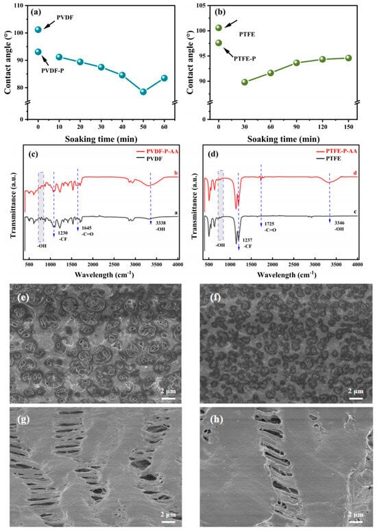 Surface characterization of the membranes: The contact angles of plasma grafted acrylic acid PVDF (a) and PTFE (b) with soaking time. FTIR spectra of the pristine and modified membranes PVDF (c) and PTFE (d). SEM (×3000) images of PVDF pristine membrane (e), PVDF-P-AA membrane (f), PTFE pristine membrane (g), and PTFE modified membrane (h).