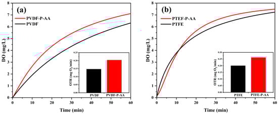 Oxygen transfer test of the membranes: (a) pristine PVDF and PVDF-P-AA membranes and (b) pristine PTFE and PTFE-P-AA membranes.