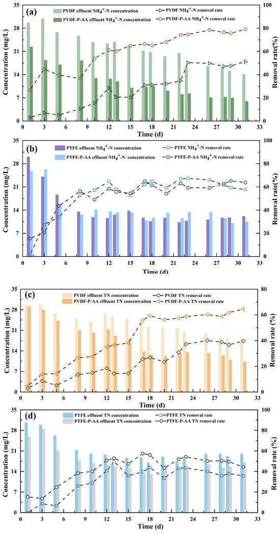 Concentration and removal rate of NH4+-N and TN during MABRs startup: (a) PVDF and PVDF-P-AA effluent NH4+-N and removal rate; (b) PTFE and PTFE-P-AA effluent NH4+-N and removal rate; (c) PVDF and PVDF-P-AA effluent TN and removal rate; (d) PTFE and PTFE-P-AA effluent TN and removal rate.
