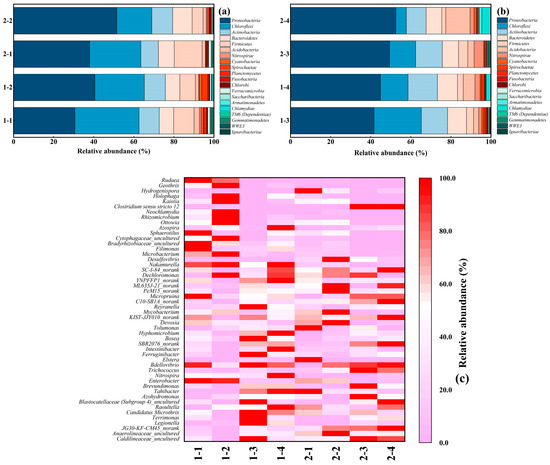 The Alpha Diversity Index, as delineated in Table 2, serves as a crucial metric reflecting the abundance and diversity of microbial communities, thus portraying the variations in microbial species richness and community diversity across distinct samples. Notably, the microbial community richness within the samples can be discerned through Operational Taxonomic Units (OTUs) and Chao indices. As evidenced by Table 2, each reactor demonstrated a discernible increasing trend in microbial abundance with the progression of biofilm formation. The R-PVDF-P-AA had significantly higher OTUs and Chao indices on day 30, signifying an extensive array of species enriching the biofilm and contributing to a more efficient NH4+-N removal rate. Moreover, species abundance in the 2-4 reactor was comparatively lower than in the 2-2 reactor. This disparity can be attributed to the characteristics of the PTFE membrane surface, which elevate the complexity of the bacterial attachment process, consequently influencing community abundance. Notably, the coverage index for all samples in the table surpassed 99%, indicating that the sequencing outcomes accurately portray the microbial composition in each sample. The Shannon index is typically applied as an estimator of microbial diversity, while the Simpson index quantitatively describes the biodiversity of a specific region. By comparing the values of these indices, the diversity of each community in the sample can be elucidated. Higher values of the Shannon index and Simpson index correspond to heightened biodiversity within the reactor. Upon comparing the Shannon index and Simpson index values obtained from samples within the same device at different time points, it becomes evident that the extension of membrane exposure time enhances the diversity and uniformity of microorganisms adhering to the hollow fiber membrane filaments in each device to varying degrees. Moreover, the Simpson index of the modified devices surpassed that of the unmodified reaction devices during the membrane formation period, signifying that the modified membrane surface facilitated efficient microbial attachment, culminating in a relatively stable and intricate community structure. On the 30th day, the Simpson index of the modified composite membrane based on PVDF notably exceeded that of the 2-4 reactor, indicating the effective enhancement of microbial affinity of the PVDF membrane grafted with acrylic acid. This enhancement aligns with the observed efficient NH4+-N and TN removal rates in the 2-2 reactor.