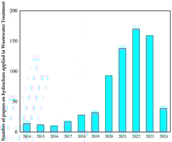 As urban modernization progresses rapidly, living standards in cities have significantly improved. Concurrently, China’s water environments are increasingly stressed. The discharge of industrial, agricultural, and domestic wastewater has progressively increased, exacerbating water pollution [28,29,30]. In addition, the development of the pharmaceutical industry, animal husbandry and the unreasonable discharge of wastewater, is causing antibiotic pollution and it is particularly prominent in the water environment [31]. The “China Ecological Environment Statistical Yearbook (2018–2023)” published by the Ministry of Ecology and Environment reports high pollutant levels in discharged wastewater, heavily impacting water environments. Industrial and agricultural wastewater discharges have significantly polluted rivers and lakes, harming the ecosystem [19,20,28,32,33]. Consequently, effectively addressing water environmental issues has become an urgent problem. Figure 2 is a statistical chart of the number of papers on the application of hydrochar in wastewater treatment from 2014 to 2024 in June. In 2014–2019, the number of papers in this area is small, and the number of papers after 2020 increases significantly, indicating that in recent years, people have conducted more and more research on the application of hydrochar for wastewater treatment, which reflects the development of this technology, the increasing attention to water environment problems, and the acceleration of the practical application and transformation of research results. In Figure 3, it can see the main keywords used in articles on applications and use the search term, on the scientific network. The terms “hydrochar yield”, “higher heating value”, “mechanism”, “adsorption” and “functional group” are more controllable terms, which may indicate that the adsorption application of hydrochar is related to the mechanism of hydrochar, the type of functional groups, and the yield and calorific value of hydrochar also have indispensable value for its application.
