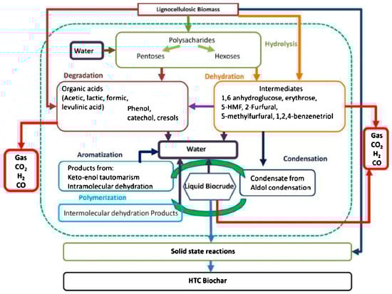 HTC is a thermochemical conversion technique that processes biomass with water at specific temperatures (180–250 °C) and pressures (2–10 MPa) into high-value carbon products [32,35], along with significant liquid and minor gaseous byproducts, primarily CO2 [36,37]. This technology effectively converts fibrous materials found in animal manure and crop residues, including cellulose, hemicellulose, and lignin [27]. HTC involves the decomposition of macromolecules into smaller molecules, which then re-polymerize [37]. The process includes hydrolysis, dehydration, decarboxylation, condensation, and aromatization [38,39]. Cellulose, for example, undergoes hydrolysis where C-O and C-C bonds break, leading to the formation of intermediates like 5-hydroxymethylfurfural, followed by dehydration and aromatization to form hydrophobic microsphere cores and hydrophilic shells through aldol condensation [40]. Similarly, hemicellulose and lignin undergo specific breakdown and reformation processes to produce high-quality, high energy-dense hydrochar [41,42]. HTC’s strength lies in the precise control of reaction parameters (temperature, pressure, feedstock particle size, and duration) enabling the production of superior quality carbons with wider application potential [43,44]. In Figure 4, the main mechanism of hydrochar formation is highlighted by describing the HTC reaction pathways from lignocellulosic biomass.