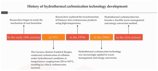 HTC traces its origins to the early 19th century when the formation mechanisms of coal began to be studied. In Figure 5, the history of HTC technology is described. In 1913, the German chemist Friedrich Bergius and his colleagues conducted carbonization of cellulose under hydrothermal conditions at temperatures ranging from 250 to 310 °C, resulting in a black carbonaceous material with a significantly reduced oxygen-to-carbon (O/C) atomic ratio compared to the raw material. Subsequently, researchers expanded the range of feedstocks to other biomass materials and systematically studied HTC processes.