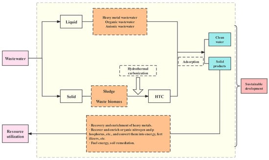 HTC products are widely used in wastewater treatment, such as heavy metals removal, organic pollutants, and anionic wastewater. Hydrochar offers several advantages in wastewater treatment, including high efficiency, versatility, low cost, and simple operation, thus realizing significant environmental and economic benefits through the “waste-to-wealth” approach. Due to its high functional group content, porosity, and surface charge, hydrochar can effectively adsorb heavy metals, organic compounds, and anions in wastewater [75]. By modifying hydrothermal conditions and adding modifiers, the quantity and types of oxygen-containing functional groups on the surface of hydrochar can be increased, thereby further optimizing the availability of active sites. In Figure 7, HTC’s liquid and solid processes for treating wastewater are described.