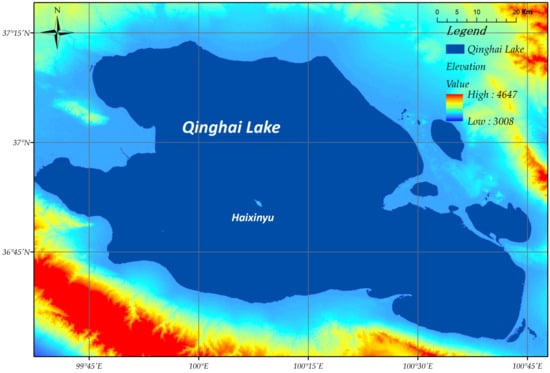 Qinghai Lake is located to the northwest of Xining City, Qinghai Province, China, between 99°36′ E and 100°16′ E, and between 36°32′ N and 37°15′ N. The lake is situated at an altitude of 3193.8 m above sea level, with a surface area of 4476 square kilometers, stretching 104 km from west to east and 62 km from north to south, as shown in Figure 1. It has an average water depth of 21 m, with a maximum depth of 27 m, and a water volume of 71.6 × 109 cubic meters. The drainage basin covers an area of 29,661 square kilometers (as of 2017) [30].