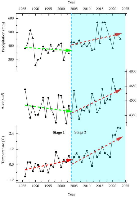 To ascertain whether the expansion of Qinghai Lake’s water body area is attributable to climate warming, we compiled and analyzed temperature and precipitation data spanning 38 years. As depicted in Figure 4, arranged from top to bottom are precipitation, area, and temperature. We delineated the data into two phases: