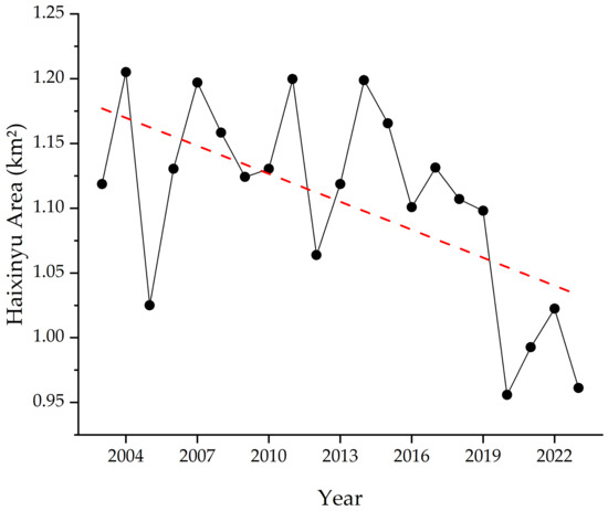 Trends in the area of Qinghai Lake’s Haixinyu, 2003–2023. The red dashed line in the above figure represents the trend line determined using least squares method.