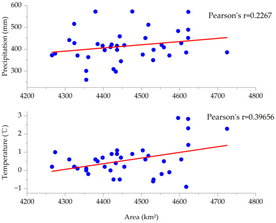 Area–precipitation and area–temperature correlation analysis graphs. The red dashed line in the above figure represents the trend line determined using least squares method.