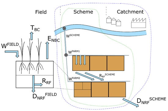 These models complement one another and were described both individually and with their nested characteristics by []. In this article, we follow on from this and include three of the previously listed scales outlined in the IEM, namely 1. field, 2. scheme, and 3. catchment, to provide different perspectives for assessing the performance of irrigation. These scales were selected as they represent tangible management levels in terms of irrigation performance assessment for the purpose of this article. Figure 1 illustrates the scales discussed relative to the combined models and the category of each water stream as a fraction.