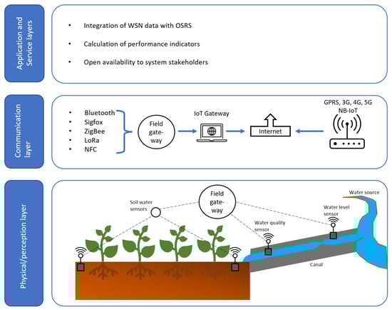 Figure 3 describes the physical layer illustrated in Figure 2. Different protocols and communication systems are available for the communication layer. Communication from the sensor nodes to the gateways can be achieved using ZigBee, Bluetooth, NFC, WiFi, LoRA, or Sigfox [,]. Energy conservation has high priority when selecting the communications protocol, and this has to be balanced with the sampling frequency, power supply, communication distances, data packet size, and regularity of communication. The use of photovoltaic cells is common to recharge the batteries of sensors []. Alternative options for a WSN power supply are limited and the positioning of these cells must be critically assessed, as a growing crop may end up obscuring the power supply of a soil water sensor in a field. The final configuration of the WSN will depend on the specific requirement of the scheme, themselves hinging on its organizational structure and physical layout. Alongside costs, power considerations will have a major bearing on the overall design of the WSN.
