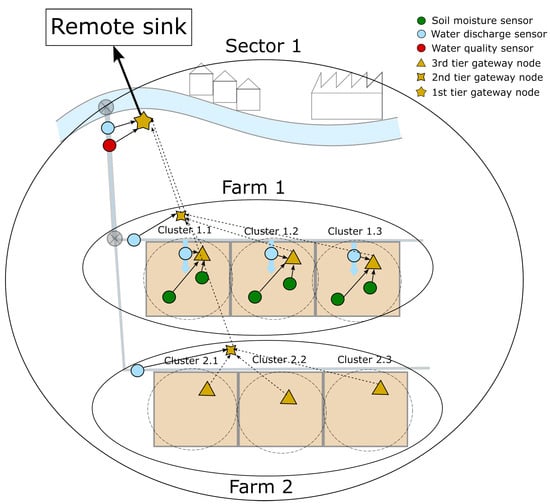 Sensors are located at nodes in a WSN and need to communicate with the Internet, to allow for ease of data collection and analysis. In applications of irrigation control alongside monitoring, sensor nodes communicate with actuator nodes that control water supply components such as pumps and valves. In this case, where solely monitoring is considered, the sensor nodes communicate with a gateway node that communicates with the Internet in a one-way direction. Due to the heterogeneous architecture of this WSN case, the nodes vary not only in sensing capability but also in transceiver ability []. Nodes are arranged in clusters that are related to the scale at which they monitor irrigation performance. An example WSN is illustrated in Figure 3, showing the hypothetical sector of an irrigation scheme containing two farms, each with three fields. Based on an architecture outlined by Ojha et al., the network is based on a cluster at field scale, which contains a discharge sensor, soil water sensor, and 3rd tier gateway nodes []. Each of the 3rd tier gateways communicates with the 2nd tier gateways at farm scale, which combined with a discharge sensor node at the point of farm supply constitute a farm scale cluster. The farm scale clusters then communicate with a 1st tier gateway node at sector level, which relays data to the remote sink communicating with the Internet.