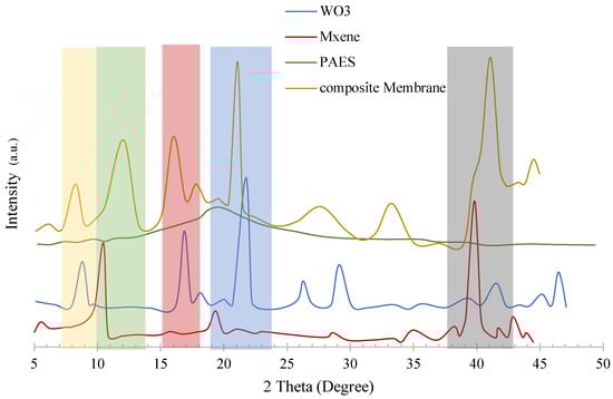 The X−ray diffraction (XRD) curves of the synthesized composite membrane, PAES, MXene, and WO3.