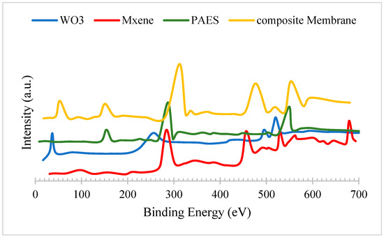 The XPS curves of synthesized composite membrane, PAES, MXene, and WO3.