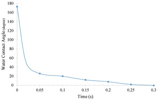 Figure 4 highlights the remarkable hydrophilic properties of the WO3–MXene composite membrane, which demonstrated superwetting characteristics. The contact angle of a water droplet on the membrane decreased from 180° ± 1° to 0° ± 0.3° within a mere 0.25 s. This finding aligns with previous studies that have investigated the wettability of membranes based on MXene, where the addition of MXene material to the membrane has been shown to enhance hydrophilicity. The results of this study suggest that the WO3–MXene composite membrane holds great potential for oil–water separation applications due to its superwetting properties. In other words, the membrane’s ability to rapidly change its contact angle and its consistency with other MXene−based membrane studies highlight its promise in addressing the challenge of efficient oil–water separation.