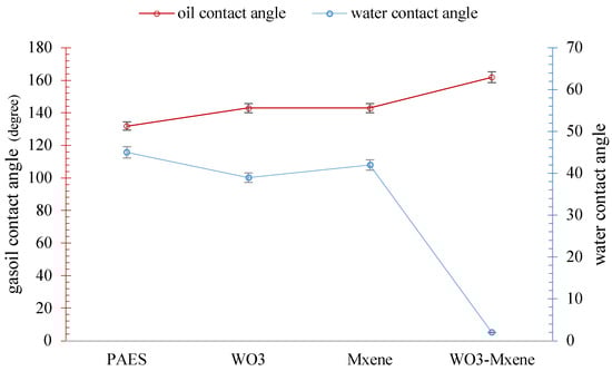 The gasoil contact angle and water contact angle of different membrane types including PAES, WO3, MXene, and WO3–MXene.