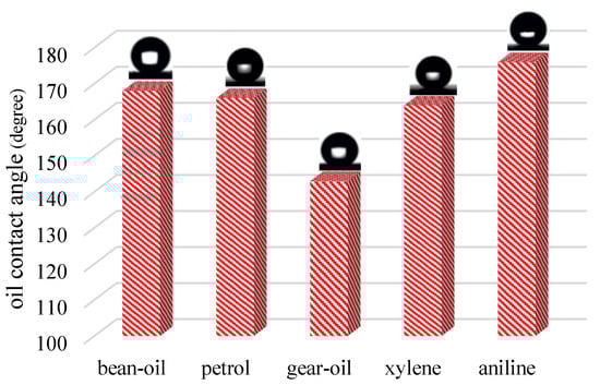 An experiment was conducted to test the fabricated membrane wettability with some types of ordinary oils, such as xylene, petrol, etc. The oil contact angles (OCAs) were not smaller than 140°, as shown in Figure 6. The composite membrane has been shown to be effective in the treatment of different light/heavy oils. Other investigations have explored the wettability of synthesized membranes for the removal of oil, including H and SH membranes with fluoropolymer coatings [39], and the wettability of photo-responsive membranes for oil treatment and photocatalytic pollutant degradation [40]. These studies have shown that membranes with wettability properties are suitable for separating oil and water.