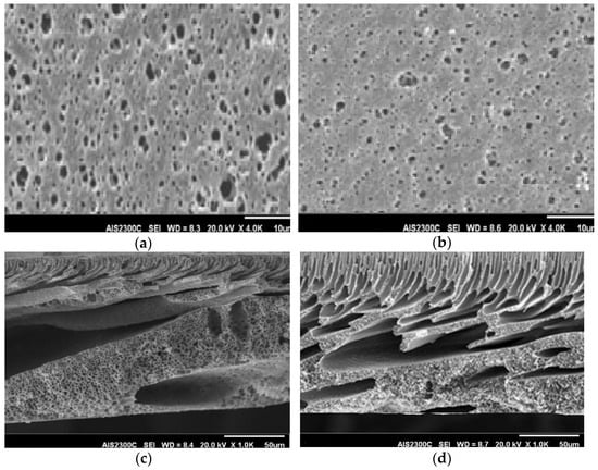 The surface and cross-section SEM images of the fabricated membranes; (a) the surface SEM of the WO3–MXene composite membrane; (b) the surface SEM of the PAES membrane; (c) the cross-section SEM of the WO3–MXene composite membrane; (d) the cross-section SEM of the PAES membrane.