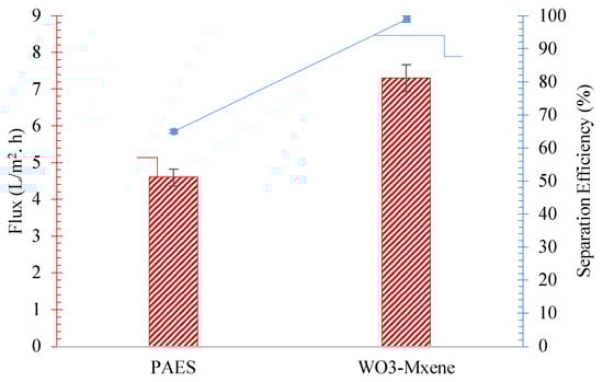 The WO3–MXene composite membrane demonstrated exceptional flux and oil–water separation efficiency, as illustrated in Figure 8. The incorporation of WO3 into the MXene membrane resulted in a significant improvement in the treatment performance, achieving a 99.9% oil–water separation efficiency compared to the original 65.0%. Additionally, the permeate flux increased to 7.4 L/m2.h from the previous 4.6 L/m2.h. These impressive results highlight the potential of WO3–MXene composite membranes for efficient gasoil–water emulsion separation and offer compelling evidence of the enhanced flux and oil–water separation efficiency of the WO3–MXene composite membrane. The membrane’s ability to achieve high separation efficiency and increased permeate flux makes it a promising candidate for various oil–water separation applications.