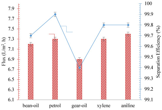 Our study demonstrated the exceptional performance of the WO3–MXene fabricated membrane in treating oil-in-water emulsions, as depicted in Figure 9. The membrane exhibited outstanding treatment efficiency, with a performance higher than 99.4% for various types of oils, including bean oil, petrol, aniline, and xylene. Notably, the treatment efficiency for all cases, except for gear oil, exceeded 99.8%, with a flux greater than 7.2 L/m2.h. Additionally, the membrane displayed a high water flux, with the lowest value recorded at 6.9 L/m2.h for gear oil separation. These results underscore the potential of the composite membrane for efficient oil–water separation applications.