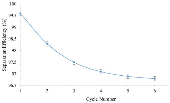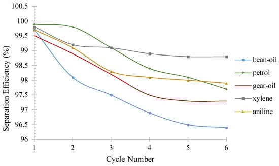The efficient treatment and flux of different oil emulsions in water were investigated in this study. Figure 11 and Figure 12 show the results obtained for separation efficiency and flux, respectively. The highest drop in separation efficiency was observed when the bean oil emulsion in water was used as the feed. After six cycles, the separation efficiency decreased from 99.7% to 96.4%, while the flux of the permeate of the water decreased from 7.2 L/m2.h to 6.8 L/m2.h in the same six cycles. On the other hand, the treatment efficiency and flux for the xylene emulsion in water remained almost constant during these cycle tests. These findings suggest that the type of oil mixture used as the feed can significantly affect the separation efficiency and flux of the system.