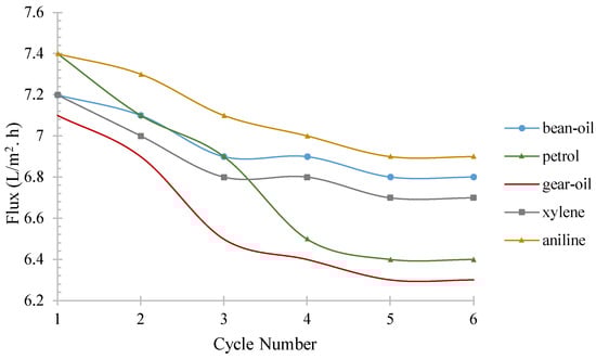 The permeated flux of WO3–MXene composite membrane in separation of different oil–water emulsions in different process cycles including bean oil, petrol, gear oil, xylene, and aniline.