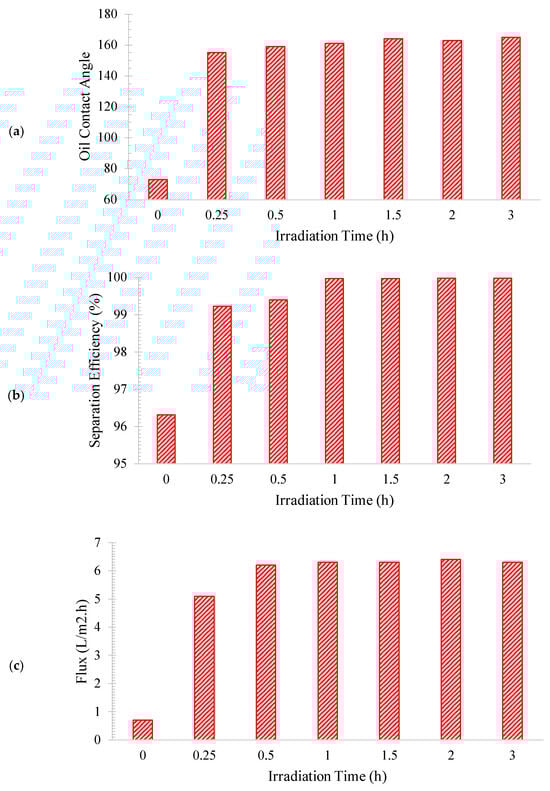 The oil contact angle, separation efficiency, and flux of the fabricated membranes after different periods of irradiation in the range of 0 to 3 h.