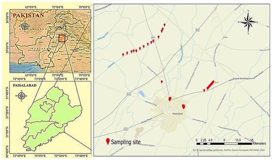 A survey study was conducted to determine groundwater quality in Faisalabad (31.4504° N, 73.1350° E), located on the flat plains of northeast Punjab, Pakistan. The total population of the city is 3.6 million. In Faisalabad, the sun’s rays are relatively direct during the summer, resulting in high temperatures (26.9–40.5 °C), while the winters (4.1–19.4 °C) are cool and dry. The average annual rainfall measures 14.76 inches, and the wind speed is 94 mph [28,31]. The management of the city’s groundwater supply is carried out by the Water and Sanitation Agency (WASA), Faisalabad. Jamal [32] explained how the city is appropriately networked.