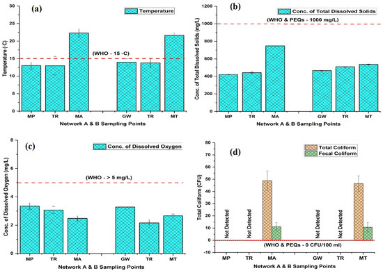The concentrations of temperature (a), total dissolved solids (b), dissolved oxygen (c), and total coliform and fecal coliform (d) in two groundwater networks: network A, spanning from Munda Pend (MP) to the terminal reservoir (TR) and then to taps in Mustafa Abad (MA), and network B, extending from Gut Wala (GW) to the terminal reservoir (TR), and then to taps in Madinah Town (MT) in Faisalabad. The mean value with standard deviation is presented in the graphs. Horizontal lines show standard values for each parameter, with the red line representing the World Health Organization (WHO) standards and the blue line representing the Pakistan Environmental Quality Standards (PEQSs) guidelines.