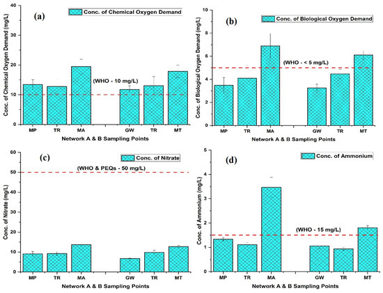 The concentrations of chemical oxygen demand (a), biological oxygen demand (b), nitrate (c), and ammonium (d) in the two groundwater networks: network A, spanning from Munda Pend (MP) to the terminal reservoir (TR) and then to taps in Mustafa Abad (MA), and network B, extending from Gut Wala (GW) to the terminal reservoir (TR), and then to taps in Madinah Town (MT) in Faisalabad. The mean value with standard deviation is presented in the graphs. Horizontal lines show standard values for each parameter, with the red line representing the World Health Organization (WHO) standards and the blue line representing the Pakistan Environmental Quality Standards (PEQSs) guidelines.