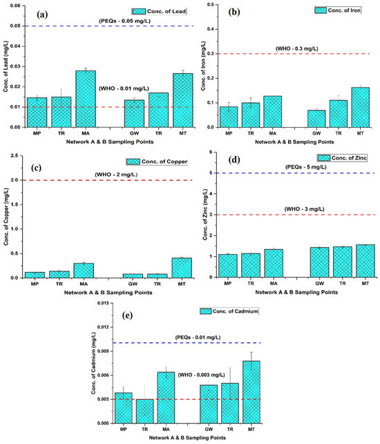 The concentrations (Conc.) of lead (a), iron (b), copper (c), zinc (d), and cadmium (e) in two groundwater networks: network A, spanning from Munda Pend (MP) to the terminal reservoir (TR) and then to taps in Mustafa Abad (MA), and network B, extending from Gut Wala (GW) to the terminal reservoir (TR), and then to taps in Madinah Town (MT) in Faisalabad. The mean value with standard deviation is presented in the graphs. Horizontal lines show standard values for each parameter, with the red line representing the World Health Organization (WHO) standards and the blue line representing the Pakistan Environmental Quality Standards (PEQSs) guidelines.