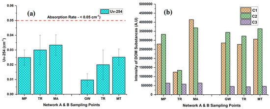 The levels of ultraviolet (Uv-254) (a) and dissolved organic matter (DOM) (b) in two groundwater networks: network A, spanning from Munda Pend (MP) to the terminal reservoir (TR) and then to taps in Mustafa Abad (MA), and network B, extending from Gut Wala (GW) to the terminal reservoir (TR), and then to taps in Madinah Town (MT) in the industrial city of Faisalabad. The microbial humic-like component is represented by C1–C2, and terrestrial humic-like substances are represented by C3. The mean value with standard deviation is presented in the graphs. Horizontal lines show the threshold level for the parameter.