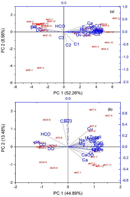We conducted a multivariate analysis to track trends and intercorrelations in the data, including PCA and the Pearson correlation matrix. PCA partitioned the data into the two components PC1 and PC2, which accounted for 52.26% and 8.56% of the variance, respectively. This collectively amounts to 60.82% of the total variance observed within network A (Figure 6a). In the case of network B, PC1 (44.89%) and PC2 (13.48%) constituted 58.37% of the total variance in the data, as depicted in (Figure 6b). The Pearson correlation statistical method, with a significance level of (p < 0.05), revealed that, in network A, metal Pb exhibited a strongly positive correlation with T, EC, TDS, Ca2+, Mg2+, CaCO3, Cl−, Na+, COD, BOD, NH4+, NO3−, Zn, and Cd, and moderately positive correlation with T. coli, F. coli, Fe, Cu, UV-254, C1, and C3. Meanwhile, a strongly negative correlation was observed with TU, pH, DO, and CO32−, and a moderately negative correlation with HCO3− and C2. Similarly, in network B, Pb demonstrated a positively strong correlation with T, EC, TDS, CaCO3, Cl−, COD, BOD, NH4+, NO3−, T. coli, F. coli, Fe, Cu, Zn, Cd, and UV-254, and positively moderate correlation with Ca2+, Mg2+, Na+, C1, C2, and C3, while there was a negatively strong correlation with TU, pH, CO32−, and HCO3−, and a negatively moderate correlation with DO (Figure 6c,d). Metal Fe in network A exhibited a strongly positive correlation with T and moderately positive correlation with EC, TDS, Ca2+, Mg2+, CaCO3, Cl−, Na+, COD, BOD, NH4+, NO3−, T. coli, F. coli, Pb, Cu, Zn, Cd, UV-254, and C1. Meanwhile, there is a strongly negative correlation with TU and a moderately negative correlation with pH, DO, CO32−, HCO3−, C2, and C3. Similarly, in network B, Fe demonstrated a positively strong correlation with T, EC, TDS, CaCO3, Cl−, COD, BOD, NH4+, NO3−, T. coli, Pb, Zn, Cd, and UV-254, and positively moderate correlation with Ca2+, Mg2+, Na+, F. coli, Cu, and C1, while there was a negatively strong correlation with TU, pH, DO, CO32−, and HCO3−, and a negatively moderate correlation with C2 and C3 (Figure 6c,d).