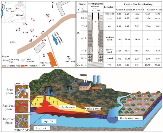 In oil spilling, extraction, refining, and transportation, the leakage of underground storage tanks and the rupture of oil pipelines will inevitably cause soil and groundwater contamination, posing serious environmental threats [,,,]. Petroleum organic components have become an important pollutant in groundwater systems, and various oil pollution incidents and their impacts on soil and groundwater have been reported worldwide [,,,]. Due to the carcinogenic and teratogenic nature of petroleum pollutants, they pose significant threats to human health and ecology [,,]. Petroleum is a complex mixture composed of a variety of organic substances with very low solubility, usually existing in soil and groundwater aquifers in the form of non-aqueous-phase liquids (NAPLs) [,]. When petroleum pollutants are discharged to the surface through various channels, they will continue to penetrate into the vadose zone and aquifers. The vadose zone is a key area where the atmosphere, surface water, and groundwater are connected and exchange water. It forms a complex system where rock and soil particles, water, and air coexist, which has the ability to absorb, retain, and transmit water, resulting in a changeable environment with complex hydrogeochemistry. More specifically, petroleum organic pollutants continuously migrate downward in the subsurface environment, undergoing various phase transitions such as volatilization, adsorption, degradation, and dissolution, forming a complex system with multiple phases and components [,,]. Upon infiltration into the subsurface environment, organic pollutants in the NAPL phase migrate downward, with some being retained in soil pores through adsorption or capillary action—referred to as the residual phase [,,]—while others continue to migrate in a fluid form under the influence of gravity—referred to as the free phase [,,]. Additionally, NAPLs can also enter the air and water through volatilization and dissolution processes, forming gas and liquid phases (i.e., dissolved phase). Qi et al. showed that benzene was likely residual at the water–NAPL interface in fine-to-medium sand aquifers []. Mohamed et al. concluded that long-term mass removal for a glop of NAPL located close to an air channel was dependent on the aqueous diffusion of the dissolved phase towards the air–water interface, which, in turn, increases with the increase in the mean particle size of the contaminated soil []. Petri et al. conducted an experiment to show that the morphology of vadose-zone NAPL strongly controls mass transfer, with occluded NAPL sources emitting considerably lower mass flux than exposed NAPL sources []. In reality, influenced by the properties of the subsurface medium, biochemical conditions, and environmental factors, continuous transformations occur throughout the NAPL phase, gas phase, and liquid phase, as depicted in Figure 1 []. During the movement of groundwater, hydrodynamic dispersion and convection will cause free NAPLs to continue to migrate and, at the same time, cause NAPLs to continue to dissolve into groundwater, eventually forming a soluble plume hydrocarbon zone []. Podgorski et al. found that the upward flow of groundwater forms a dissolved pollution plume, and with the movement of groundwater and microorganisms, the pollutant components will shift low-molecular-weight (MW) aliphatic, reduced compounds to high-MW unsaturated (alicyclic/aromatic), which are high-oxygen compounds that are consistent with carboxyl-rich alicyclic molecules []. When there is a saturated lens of free NAPLs in a body of groundwater, it will rise or fall with the same trend as the phreatic surface of the groundwater, and some free NAPLs will migrate downward into the saturated zone, leading to contamination of the soil and groundwater [].