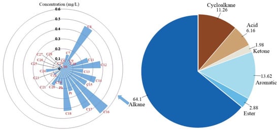 As petroleum components mainly exist in three forms when migrating in pores, in order to grasp the component concentration distribution, the content and type of the three forms must first be clarified. During the experiment, the discharged liquid was continuously collected, taking a sample every 8 min, which was put into a 10 mL centrifuge tube and centrifuged for 3 min at 10,000 rpm in a Sigma3-18K high-speed centrifuge. As the density of the component is less than that of water, free components will remain in the upper layer in an undissolved free phase; meanwhile, the stained component in the lower layer will be in a dissolved phase. GC-MS scanning analysis was performed on the two forms of samples, where the liquid in the lower layer was the dissolved phase concentration, and the upper layer was the free phase concentration. The components in the soil are in a residual phase. The relationships between the three-phase concentration changes with time are shown in Figure 8.