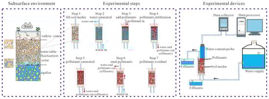 The transport and transformation of pollutants in the underground environment can be attributed to the interactions resulting from different substances in the soil pore space. Underground soil pores contain three types of substances—water, organic pollutants (NAPLs), and air—which together fill the entire pore space. According to the ratio of the soil pore space they occupy to the entire soil pore volume, their saturation in the underground environment can be described; that is, when the soil pores are filled with two or more immiscible fluids (liquid or gas), the saturation Si of a certain phase fluid (i) at a certain point is defined as the characteristic unit around that point in terms of the ratio of the volume of fluid (Vi) occupied by the volume of soil pores (Vpores). In particular, Si = Vi/Vpores = θi/n, where i indicates water, NAPL, and air (where the sum of the three is 1; that is, Swater + SNAPL + Sair = 1); θi represents the moisture content; and n represents the porosity. Therefore, to calculate the residual phase saturation of NAPLs, it is necessary to obtain the saturation of water and air. Based on this principle, the soil column was first completely filled with NAPL to form residual saturation, after which water was injected to discharge the free NAPL while ensuring that the entire pore only contained water and NAPL; that is, there was no gas in the pore (Sair = 0). Then, SNAPL = 1 − Swater, and Swater = θwater/n (where θwater represents the moisture content). After measuring the moisture content with a moisture content meter, the residual saturation of the component in the soil medium can be calculated. In addition, during the experiment, the interconversion mechanism between the three phases was also studied based on the relationship between moisture content and changes in component concentration.