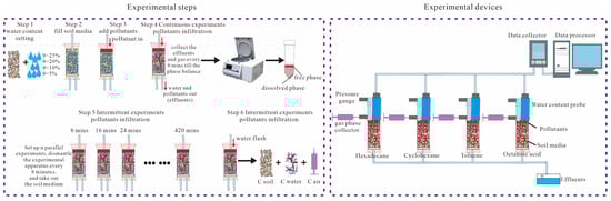 Batch experiment 2: The change processes of different petroleum pollution components in soil and groundwater can be summarized into the gas phase formed via volatilization, the dissolved and free phases of the liquid phase, and the residual phase confined to soil pores and adsorbed by soil particles. These three types coexist in soil pores, transforming and influencing each other. When the soil moisture content changes, the mobilization patterns of the components of NAPL pollution will also change accordingly. The multi-phase mobilization process was also studied based on Si = Vi/Vpore = θi/n (where i indexes water, NAPL, and air) and Swater + SNAPL + Sair = 1. Swater = θwater/n, Sair = Sair-initial (Pmeasured/Pinitial), Sair-initial and Pinitial are the gas saturation and pressure at the initial moment, respectively; Pmeasured is the gas pressure measured during the experiment. The saturation relationship at the initial moment is Sair-initial = 1 − Swater-initial. According to the pore properties of different media, four moisture content conditions of 25%, 20%, 10%, and 5% were set for comparison when different soil moisture contents were simulated in the experiment. During the soil media filling process, the specific steps involved (1) evenly mixing a certain weight of soil and water, according to the required moisture content ratio, and (2) then adding it layer by layer while continuously tamping it to ensure the uniformity of filling (Figure 5). (3) After filling, a syringe was used to inject 15 mL of the petroleum component (with Sudan IV) into the upper port of the glass tube. (4) The dyed contamination components located on the surface began to slowly penetrate the soil pores due to gravity. However, due to the different moisture contents in the soil and different properties of the medium, there were obvious differences in the infiltration process. In order to reflect these differences, the soil moisture content and gas pressure were monitored in real time during the infiltration process, and the corresponding saturation was calculated to explore the change patterns of the three phases. (5) When the measured soil moisture content reached equilibrium, it was considered that the mutual transformation between the three phases reached equilibrium, and the experiment was stopped. (6) In addition, in order to obtain the change pattern relating to the concentration of the components in the three phases, a parallel experiment method was used; that is, four sets of experiments were set up under the same conditions. When the mobilization reached a certain time, the samples were taken out and the component concentrations were measured. The time series for hexadecane and octanoic acid were 0.5, 1.5, 2.5, and 3.5 h, while the time series for toluene and cyclohexane were 0.5, 1, 1.5, and 2 h.