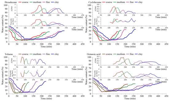 The mobilization of pollution components requires power and space. Water is the main carrier of pollution components. Its content in the pores seriously affects the mobilization and fate of components; meanwhile, the interaction between the viscosity of components and soil particles is another major factor. In the experiments, a soil moisture content meter was used to monitor the change processes relating to the moisture content in the soil column in real time for 2 min each time, and the concentration, viscosity, and functional groups of the liquid during the discharge of NAPL were analyzed. The results are shown in Figure 6.