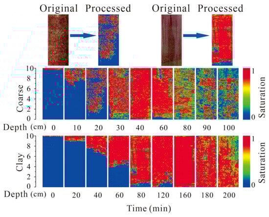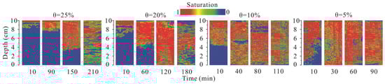 As can be seen in Figure 9, the differences in mobilization under different moisture contents are relatively obvious, which is consistent with the previous mechanism analysis. After entering the soil, the pollutant components continue to displace water and are gradually distributed to different locations. Therefore, the moisture content in the soil controls the mobilization of pollutant components. As the pollutant components are all substances with densities lower than that of water, with a high water content, the NAPLs mainly tend to float in the water, making penetration difficult. From the figure, the change observed when the moisture content is 25% illustrates this mechanism well. The red contaminated area was mainly concentrated on the surface of the soil for a long time (about 1.5 h), then began to slowly expand under the action of gravity, penetrating deep into the soil. Even at about 150 min, the entire soil column was not completely filled. On the contrary, the red area in the low-moisture-content experiment almost filled the soil column within 10 min.