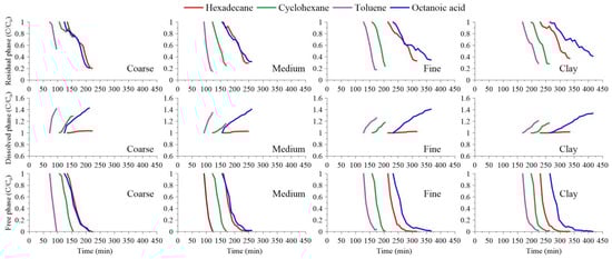 As can be seen in Figure 6, the moisture content mainly presented three stages—decreasing, balancing, and increasing—which correspond to the infiltration, saturation, and discharge of NAPL in the soil, respectively, indicating that changes in moisture content are closely related to component concentrations and soil properties, and there are differences between different components and different media. First, this is due to the large differences in pore size, soil particle size, and adsorption performance in different media. The particle size of coarse sand is larger, with an average particle size (d50) of 653.55 μm. During the drainage stage, the time for the moisture content to reach equilibrium is the shortest (average 173 min), while, in clay (d50 is 45.53 μm), the time was the longest (average 312 min)—about 1.8 times that of coarse sand. In the NAPL saturation stage, due to the different clay particles contained in the medium, the adsorption capacity for components also differed. The clay content in coarse sand was only 1.01%, and the components moved faster in it; thus, it took the shortest time to fill the entire soil column. Meanwhile, when the clay content was 11.82%, it had the strongest ability to block the components. In addition, the differences between components are also obvious. The viscosity of hexadecane is relatively high (3.34 mPa·s), but its solubility is extremely low, and it is difficult to volatilize. Therefore, water is mainly displaced slowly during the mobilization process, and it takes a long time for the moisture content to reach equilibrium—about 338 min. The change process relating to moisture content for octanoic acid (viscosity 5.83 mPa·s) is similar to that of hexadecane, and the time required to reach equilibrium is 420 min. The viscosity of naphthenic hydrocarbon is 0.98 mPa·s, which is close to that of water. Therefore, it was less hindered during the infiltration process, and the time to reach final equilibrium was faster—about 262 min. Relatively speaking, toluene has the lowest viscosity, the strongest volatility, and the highest solubility; therefore, it mainly tends towards the water and gas phases and its residence time in the soil was the shortest—about 226 min. The moisture content in the soil after finally reaching equilibrium can be calculated as S residual = (n − θw)/n (where S residual represents the soil residual saturation, n represents soil porosity, and θw represents the final soil column moisture content). The residual phase saturation values of each component in different media are provided in Table 3.